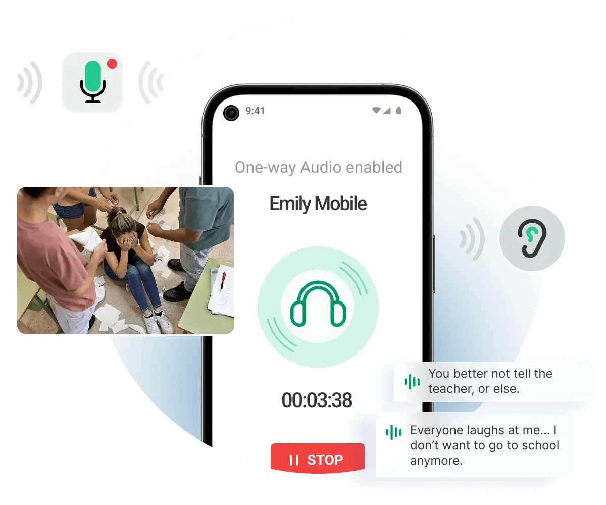 Stay instantly informed by seeing and hearing what's happening on your child's phone and around them—right as it happens. Whether it's the screen, camera, or mic, you're always in the loop.